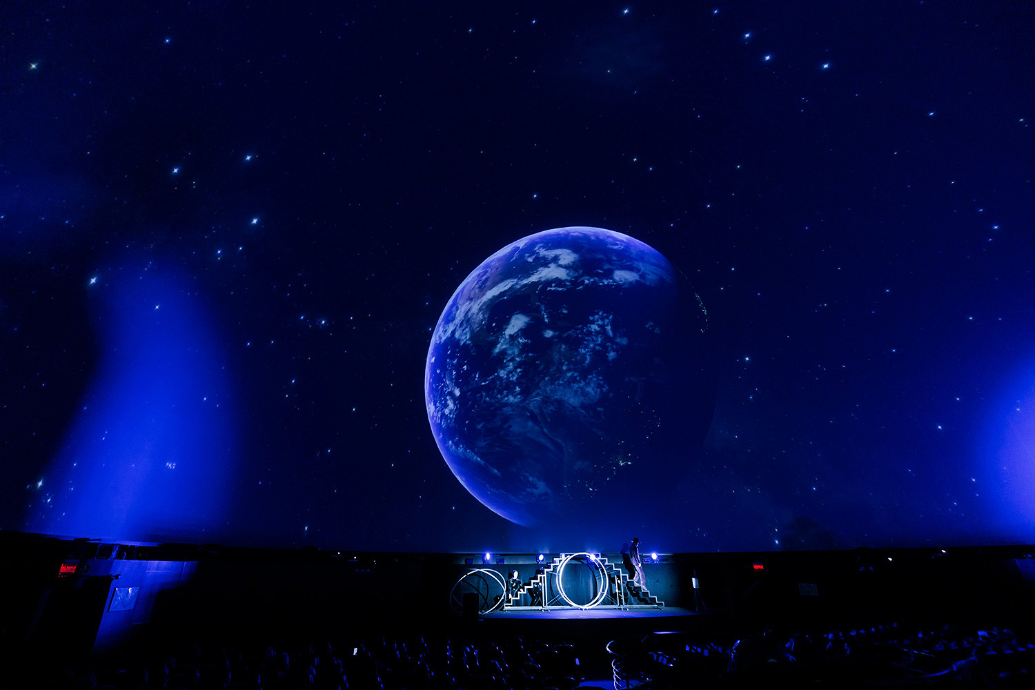 В Московском Планетарии для спектакля «Коперник» использовали систему «Универсариум М9», представляющую собой, целую экосистему: 8 мощных проекторов, синхронизированных с точностью до миллисекунды, чтобы на куполе не было разрывов, теней или «размытых» краев.
